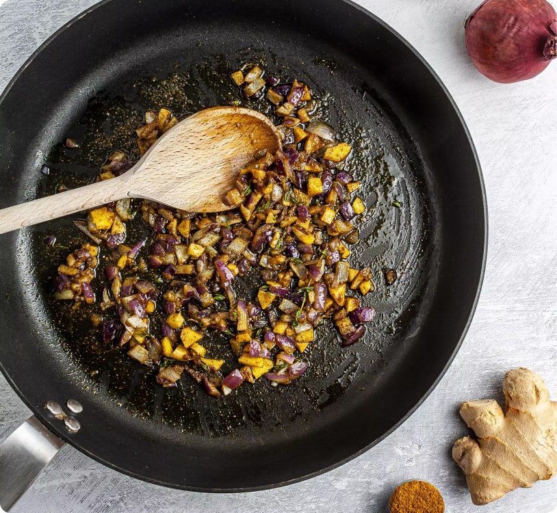 Next, heat the vegetable oil in a large skillet and then add the chopped onion and crushed garlic. Sizzle until the garlic is fragrant and then, add the sliced ginger, curry powder, allspice, and torn thyme sprigs.